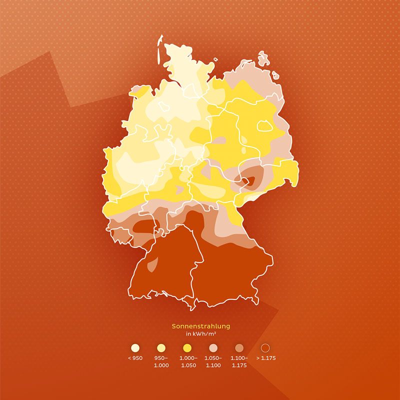Ein Quadratmeter Fläche wird in Deutschland im Jahresdurchschnitt von einer Sonnenenergiemenge von 1.000 Kilowattstunden bestrahlt. Bis zu 1.200 Kilowattstunden können an besonders günstig exponierten Standorten anfallen.